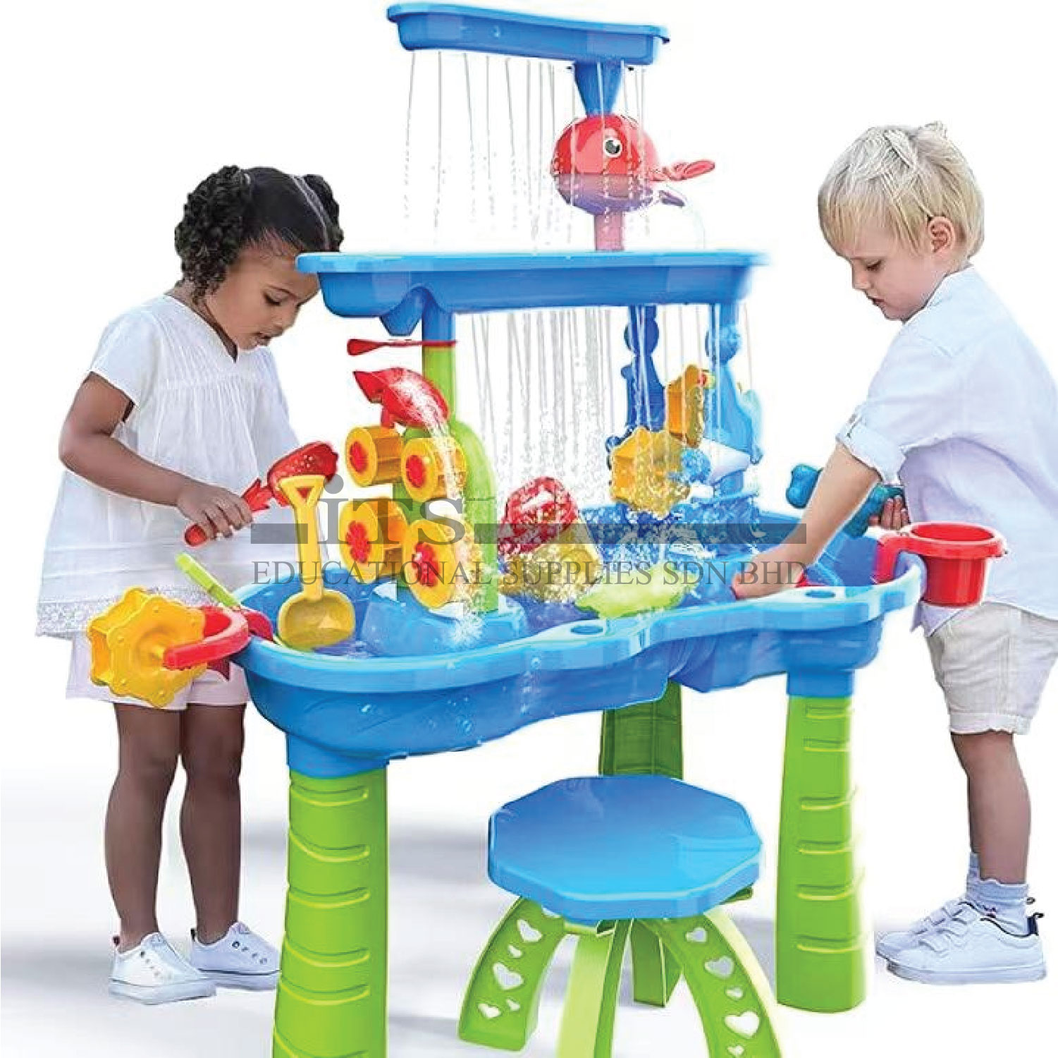 Meja Main Air dan Pasir 3 Tingkat dengan Kerusi – Meja ini direka bertingkat untuk ruang bermain lebih luas, dilengkapi pelbagai aksesori dan stesen permainan supaya beberapa kanak-kanak boleh bermain bersama sambil belajar berkongsi dan bergilir. Bukan saja boleh diisi air, meja ini juga boleh diisi salji, pasir, beras atau kacang untuk aktiviti sensori, sesuai digunakan di dalam atau luar rumah.