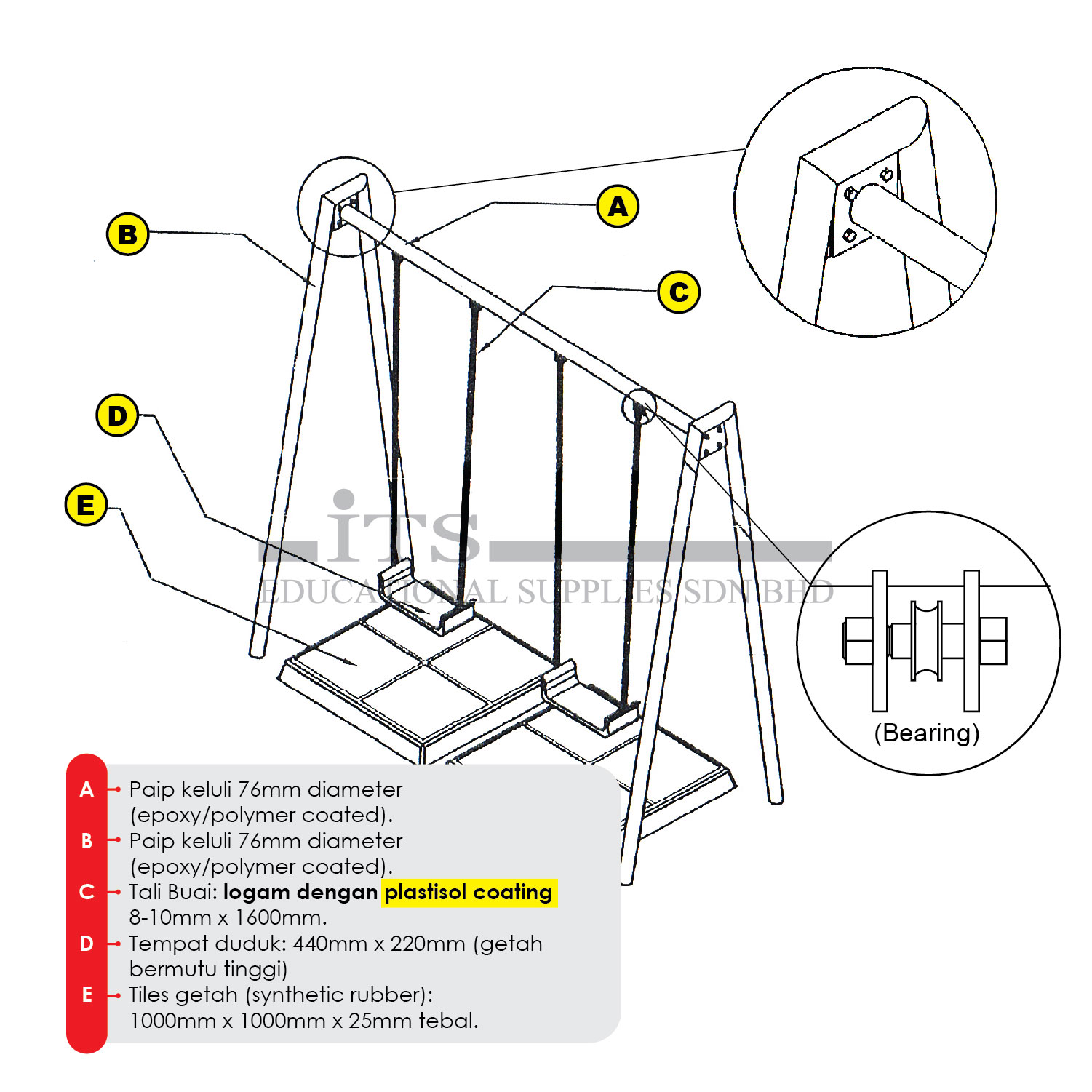 - E – Tiles getah (synthetic rubber): 1000mm x 1000mm x 25mm tebal.