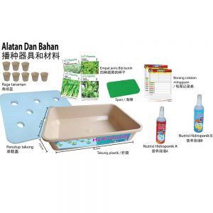 ALATAN & BAHAN – 1) RAGA TANAMAN X 8 , 2) BIJI BENIH X 4 JENIS , 3) SPAN X 1 , 4) BORANG CATATAN MINGGUAN , 5) NUTRISI HIDROPONIK A X 1 , 6) NUTRISI HIDROPONIK B X 1 , 7) TAKUNG PLASTIK DENGAN PENUTUP X 1
